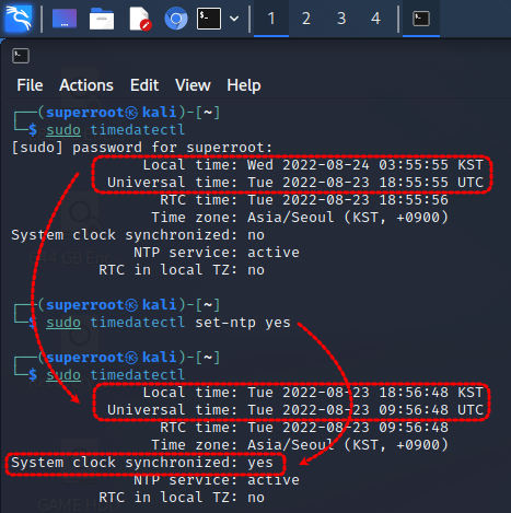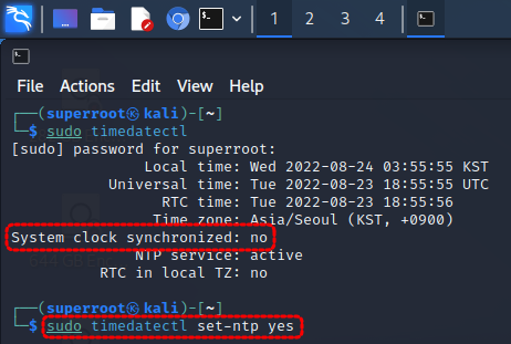 System clock synchronized:no 상태군요. 우선 System clock synchoronized: yes로 바꿔줘야 합니다.