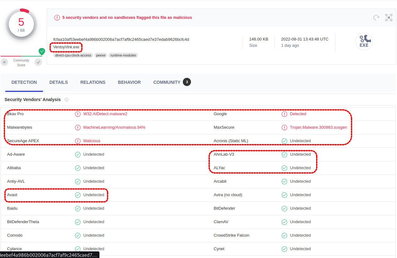 "VentoyVlink.exe" 파일은 Virtual disk파일을 Grub bootaler에 link 시켜줄 때 사용하는 것 같습니다. 역시 EFI 파티션 접근 및 Boot loader에 뭔가 영향이 있어서 그런지 탐지되는 검색 엔진들이 많이 늘어났습니다.