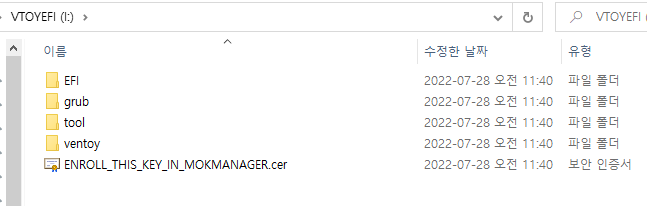 VTOYEFI 파티션에는 grub가 있으며, 이 파티션의 내부에 있는 파일을 수정하거나 하시면 Ventoy 자체에 에러가 발생할 수 있습니다. 그대로 두시면 됩니다.