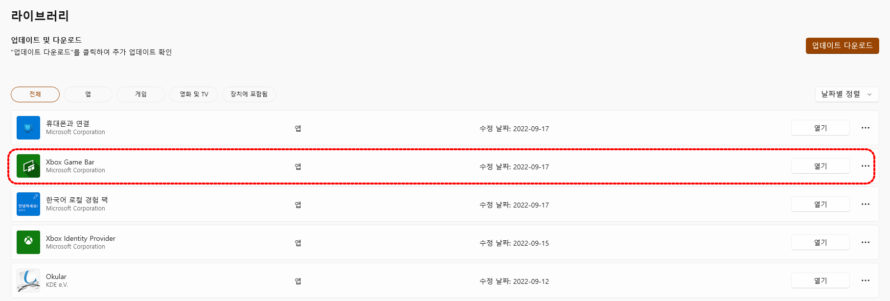 Xbox game bar 앱 업데이트 날짜 및 시간에 맞게 일부 파일들의 '수정한 날짜'가 바뀌어 있음을 확인할 수 있습니다.