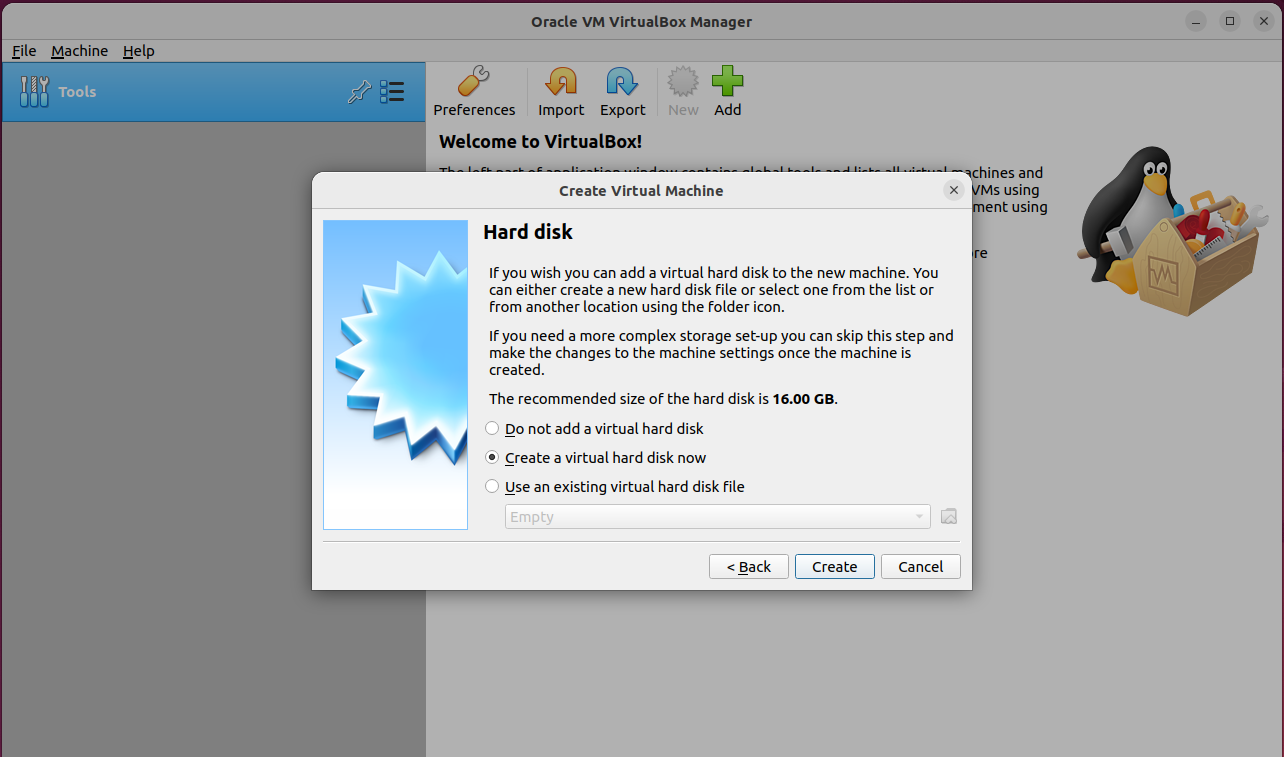 'Create a virtual hard disk now' 메뉴를 선택하고 'Create' 메뉴를 선택합니다.