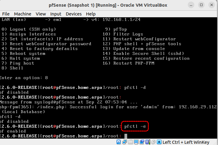관리자 페이지에서 모든 설정이 끝났다면, 다시 Shell에서 pfctl -e 명령어를 실행하여 패킷 필터링을 활성화시켜주세요.