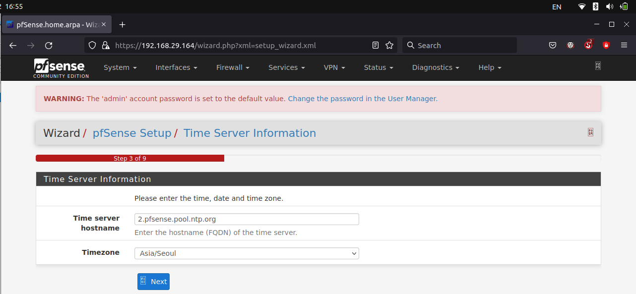 Time server hostname은 기본값으로 두시고, Timezone만 Asia/Seoul을 선택합니다.