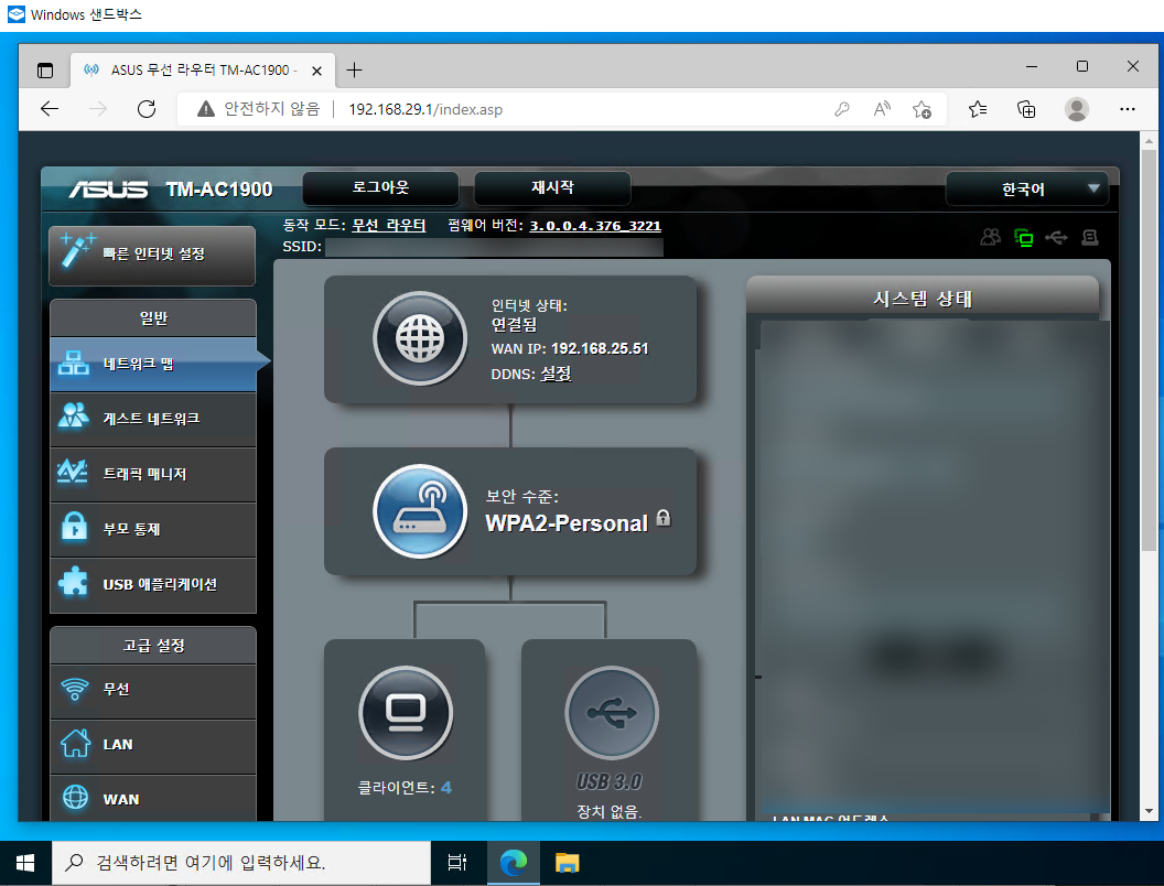 샌드박스를 실행시키고 기본 설치된 Edge 브라우저에서 TM-AC1900 관리자 페이지로 접속을 시도해보았습니다.