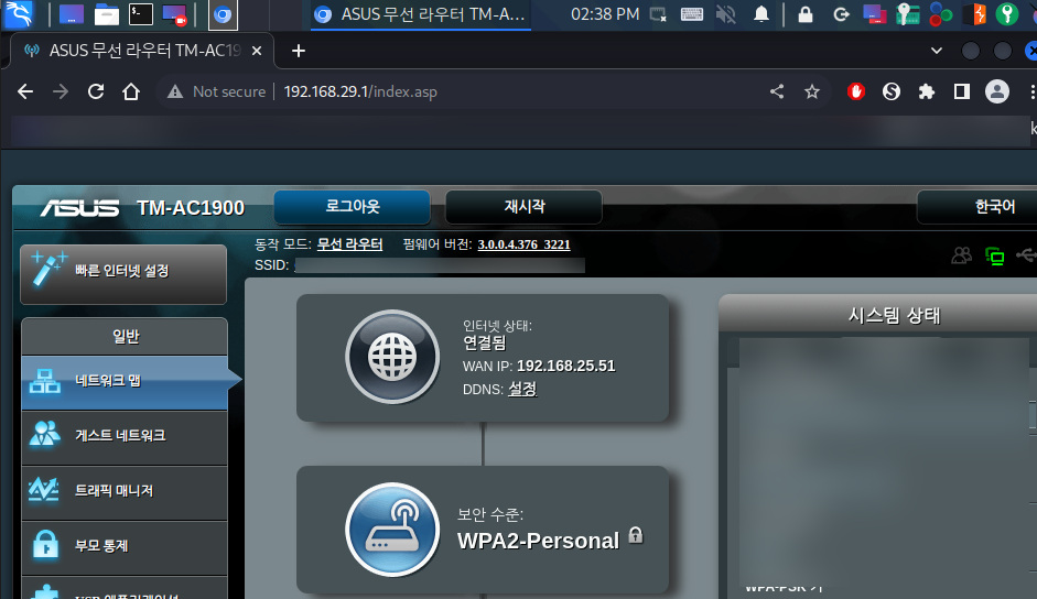 Kali Linux에 설치된 Chromium 107.0.5304.87에서 역시 정상적으로 TM-AC1900 관리자 페이지에 접속할 수 있었습니다. 윈도 크롬 버전(107.0.5304.88)과는 다르네요.