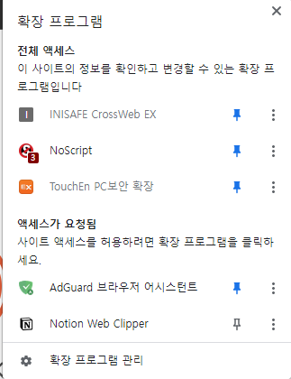 혹시라도 제가 사용하는 확장 프로그램의 영향일지 몰라서, 확장 프로그램 리스트 역시 올려봅니다. 기존에도 이 확장 프로그램만을 사용했습니다. 바뀐 사항은 Adguard, NoScript 버전 정도라고 생각됩니다.