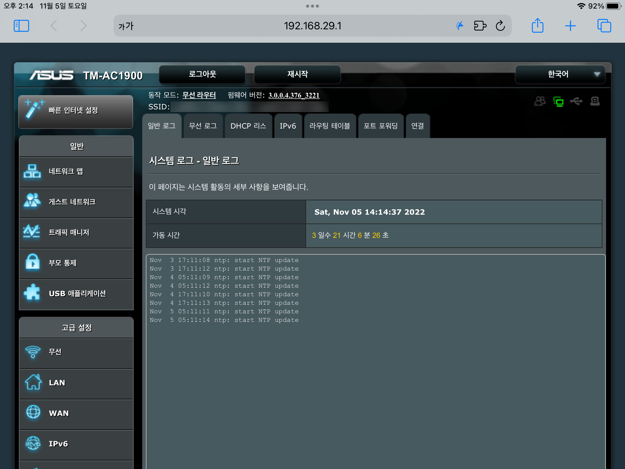 다음으로 아이패드 Safari 브라우저를 통해 TM-AC1900 관리자 페이지로 로그인을 해봤습니다. 정상적으로 로그인이 잘 됩니다.
