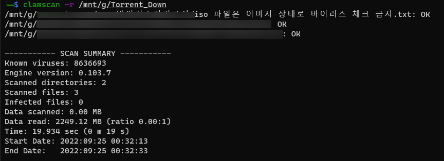 clamscan -r 경로 및 디렉터리 명을 입력하면 해당 경로의 디렉터리 및 그 하부 디렉터리에 있는 모든 파일을 체크하게 됩니다.