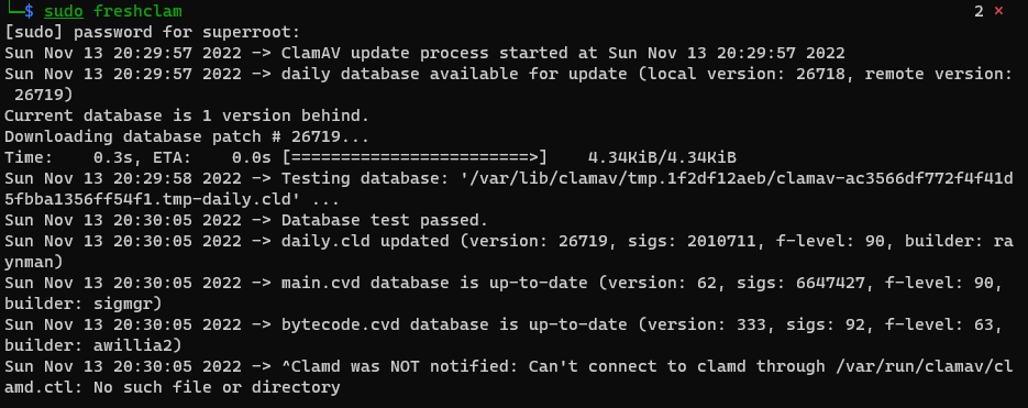 프로그램 설치 후 본격적인 바이러스 점검에 앞서 ClamAV의 database 업데이트가 필요합니다. sudo freshclam 명령어를 사용하여 database를 업데이트할 수 있습니다.