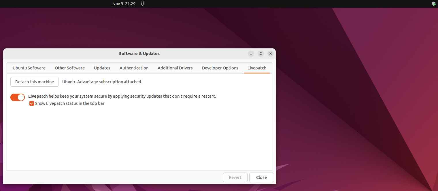 Livepatch Settings에서 Livepatch가 활성화된 상태라면, 컴퓨터 종료 없이도 중요 security pach가 적용됩니다.