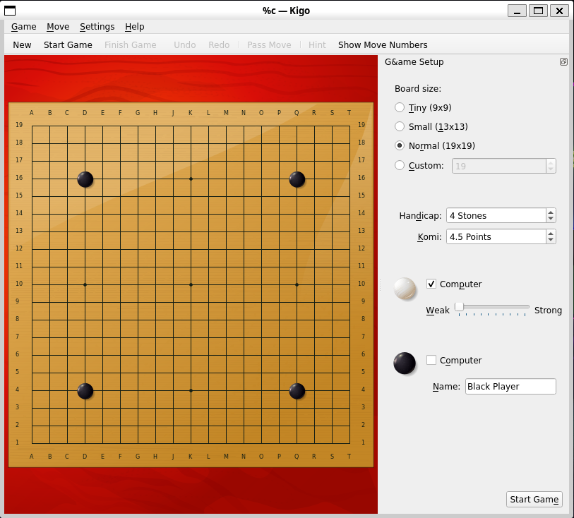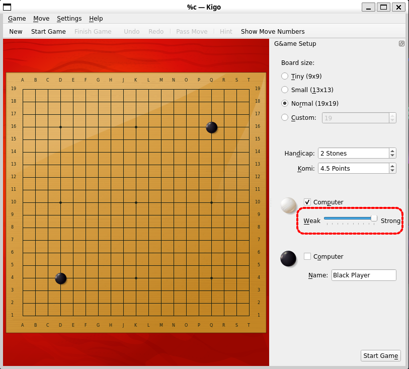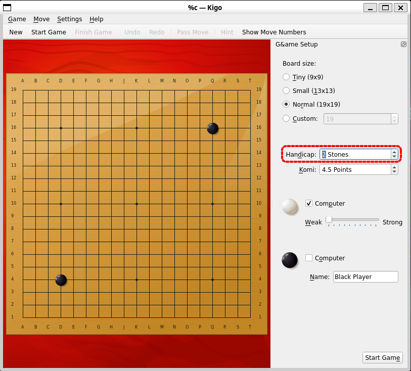 고수와 바둑을 둘 때 Handicap에서 돌 수 (0 ~ 4)를 정할 수 있습니다.