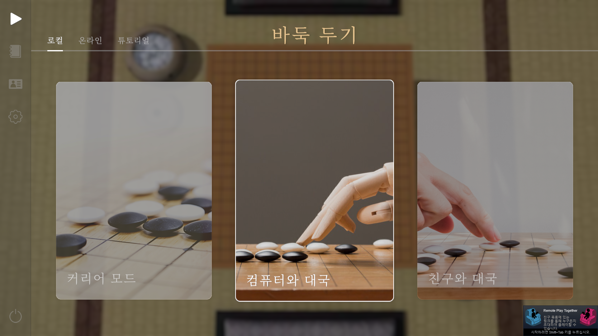 저 같은 생초보를 위한 튜토리얼이 제공되며 커리어 모드, 컴퓨터와 대국, 친구와 대국, 온라인 대국 등의 메뉴를 제공합니다.