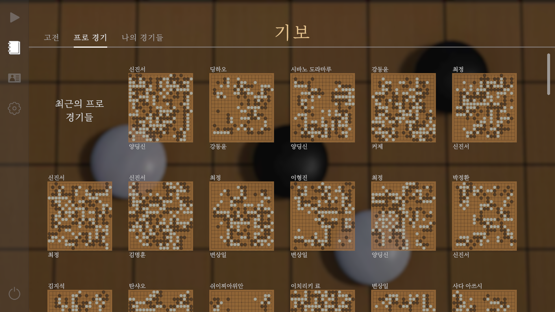 바둑에 대해서 보다 전문적으로 공부하시는 분들은 "기보"를 챙겨보실 텐데요. 고전에서부터 "프로 경기", "나의 경기들" 기보를 확인할 수 있습니다.