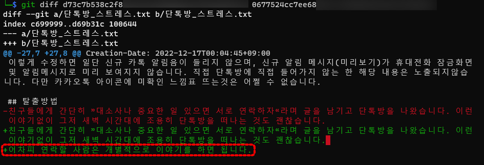 터미널에서는 녹색으로 보이는 부분이 변경된 내용입니다.