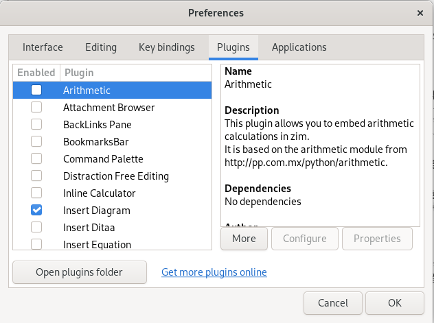 다양한 Plugins을 제공합니다. Dependencies에 No dependencies라고 나오는 기능은 그냥 Enabled에 체크만 하면 그 기능을 바로 사용할 수 있습니다. 만약 Dependencies에 뭔가 필요한 프로그램의 이름이 나온다면 "More" 버튼을 눌러서 설치할 프로그램 이름과 설치 명령어를 확인하고 그대로 설치하시면 됩니다.