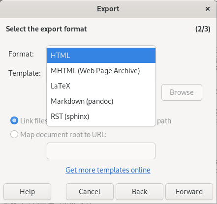 Zim Desktop Wiki의 기본 생성 문서는 txt 파일이지만 Export 기능을 사용하여 HTML, LaTex, Markdown 문서로 변환할 수 있습니다.