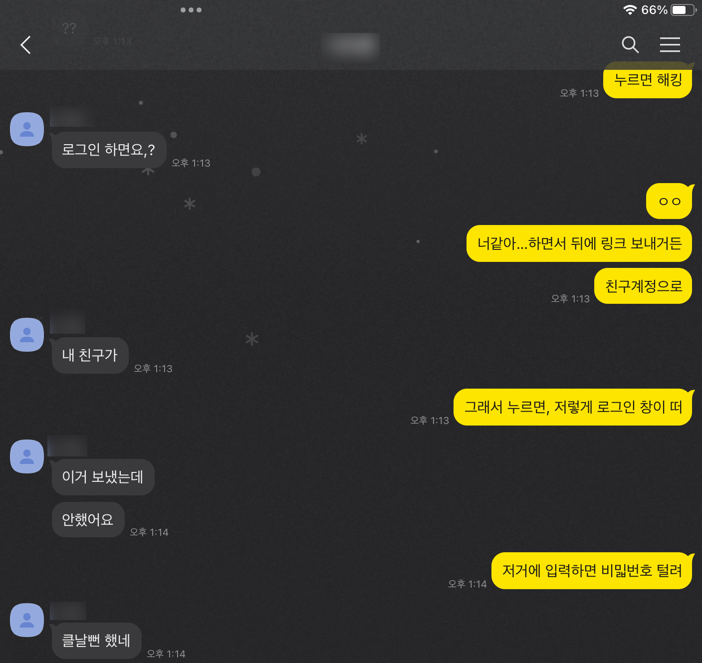 이런 수법이 유행하고 있음을 조카에게 알려줬습니다. 역시나 조카도 같은 링크를 받았었다며 놀라워하더군요. 이 수법은 초등학생~중학생사이에 매우 유행처럼 번져가고 있습니다. 자녀가 있다면 미리 이런 수법에 대해서 알려주는 것이 좋을 것 같습니다.