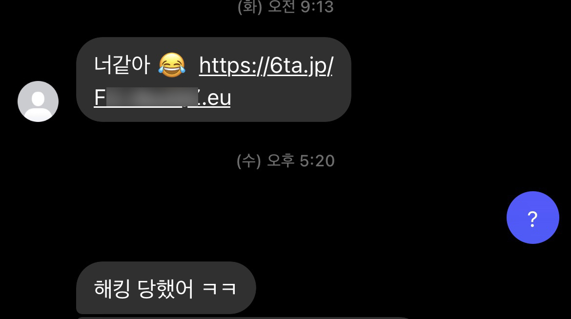 "너같아 6ta~"로 시작하는 피싱 수법이 유행이라 글을 올립니다. 이런 메시지는 주로 친구나 지인이 메시지와 함께 피싱링크를 보내기 때문에 쉽게 해킹을 당할 수 있습니다. 뒤늦게 해킹을 인지한 지인이 "나! 해킹당했어~"이런 문자로 뒷북을 치곤 합니다.