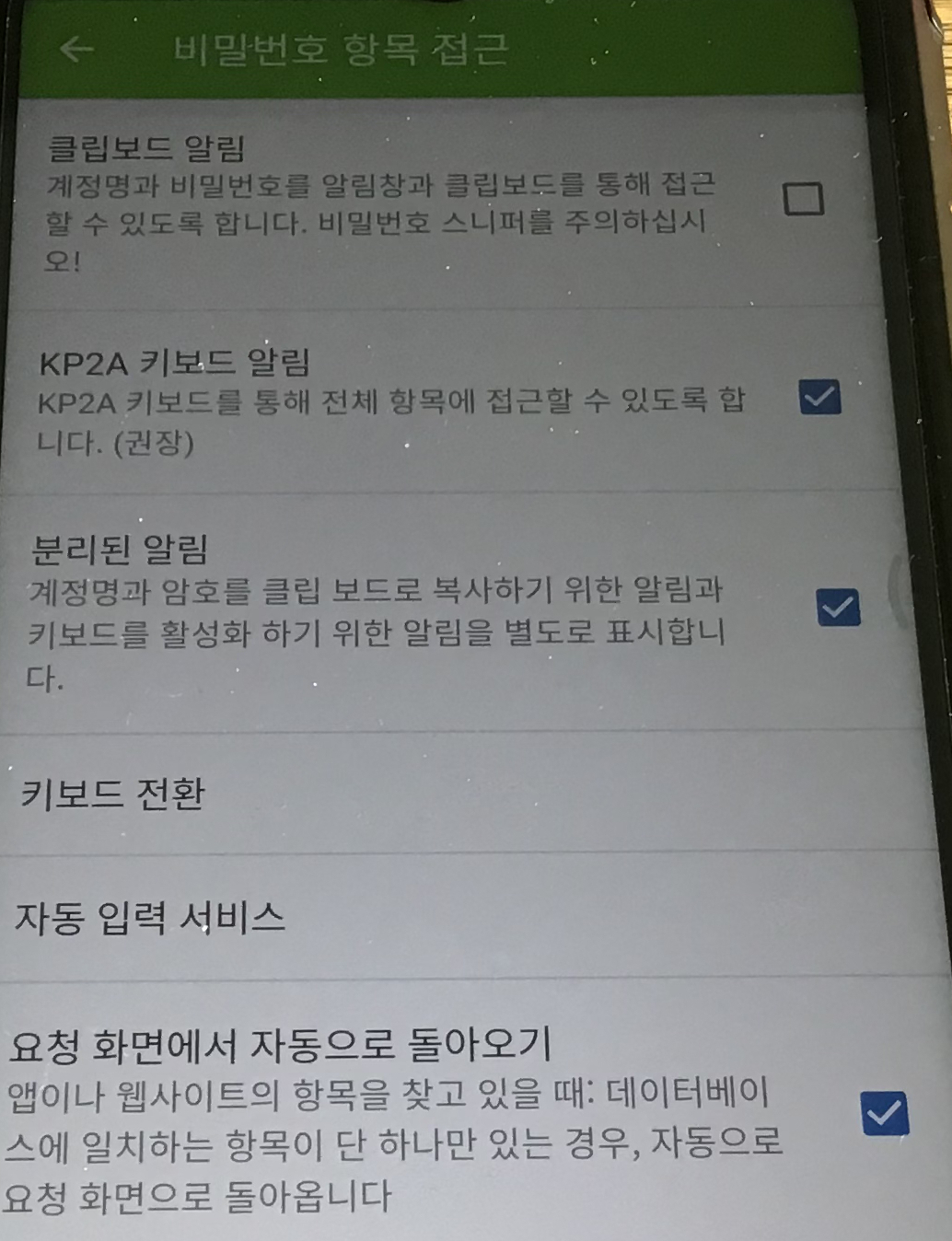 제가 사용하는 안드로이드 키보드의 경우, 기본적으로 시크릿 모드로 사용하고 있습니다. 혹시 시크릿모드가 지원되지 않거나 보안에 우려가 된다면 Keepass2Android의 자체 키보드를 사용할 수 있도록 "키보드 전환" 메뉴에서 설정하는 것도 좋을 것 같습니다.