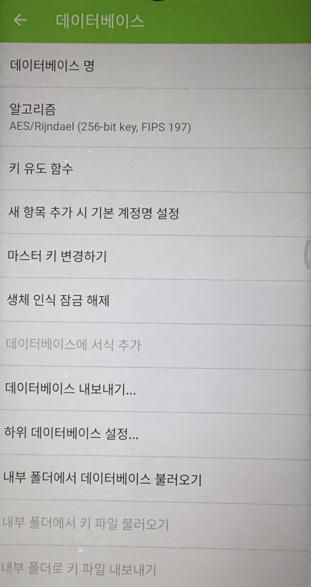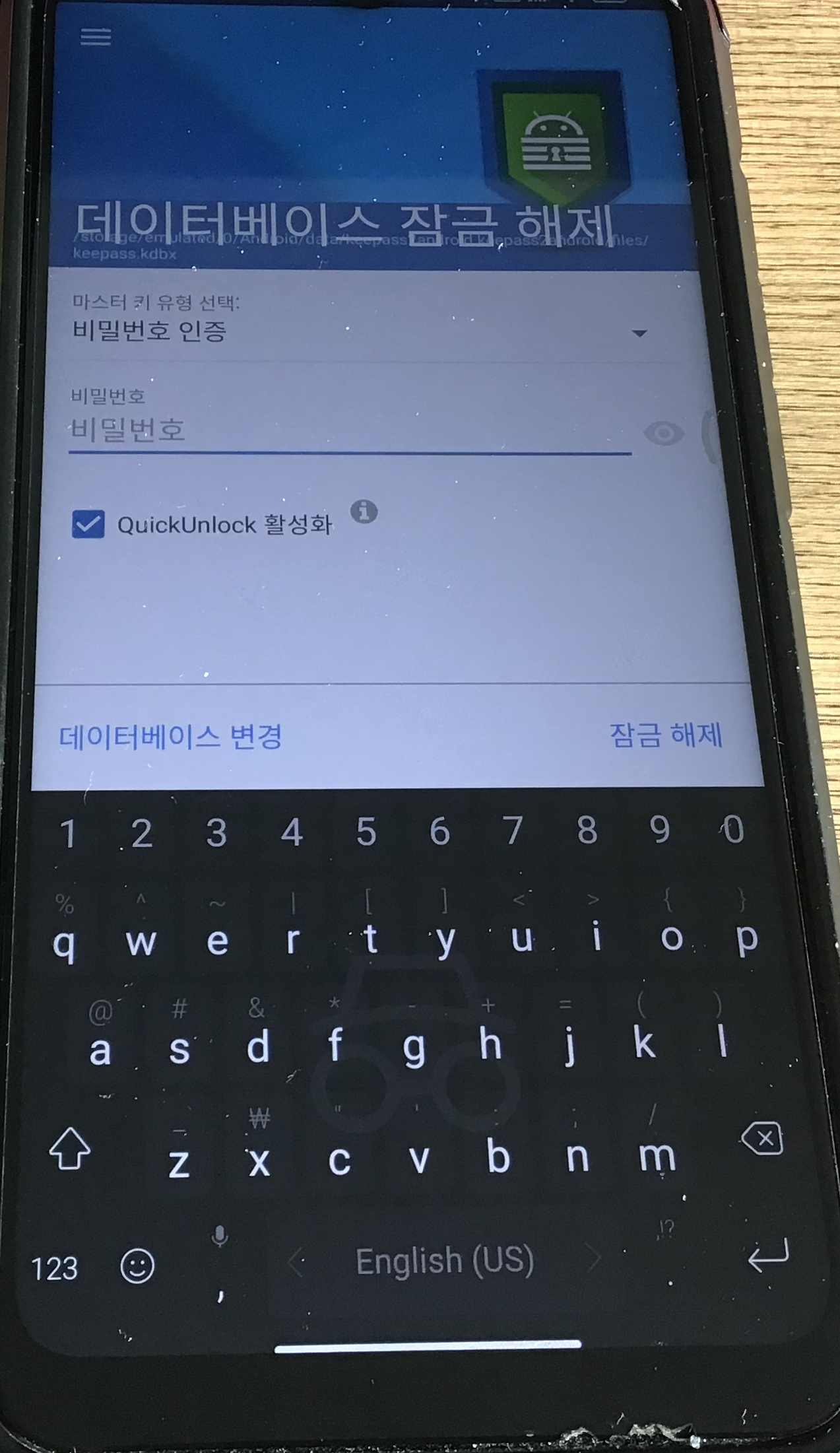 DB 잠금 해제 이후 데이터베이스 설정 메뉴가 활성화됩니다. 이 메뉴를 통해서 "마스터 키 변경", "생체 인식 잠금 해제"등을 할 수 있습니다. "생체 인식 잠금" 기능은 휴대폰에 생체 인식 잠금장치가 인식되면 Keepass2Android에서 해당 기능을 사용할지 물어보는 화면이 나오게 됩니다. Keepass2Android를 사용하면서 일정 시간이 지나게 되면 DB가 잠귀게 되는데요 QuickUnlock 생체 인식 잠금 해제 기능을 사용하게 되면 간단히 지문인식 등으로 다시 DB 잠금 해제를 할 수 있게 됩니다.
