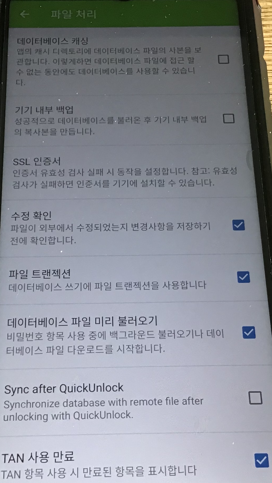 파일처리 메뉴에서는 "데이터베이스 캐싱", "기기 내부 백업" 메뉴가 기본적으로 체크되어 있습니다. 데이터베이스 잠금 해제 이후 캐싱이 되는 것 같은데요, 전 이것도 싫어서 캐싱 기능을 해제해서 사용합니다. DB 위치 역시 관리가 편한 곳에 저장해서 별도의 백업파일 자동생성 역시 해제했습니다. 개인의 취향에 따라 설정하시면 될 것 같습니다.
