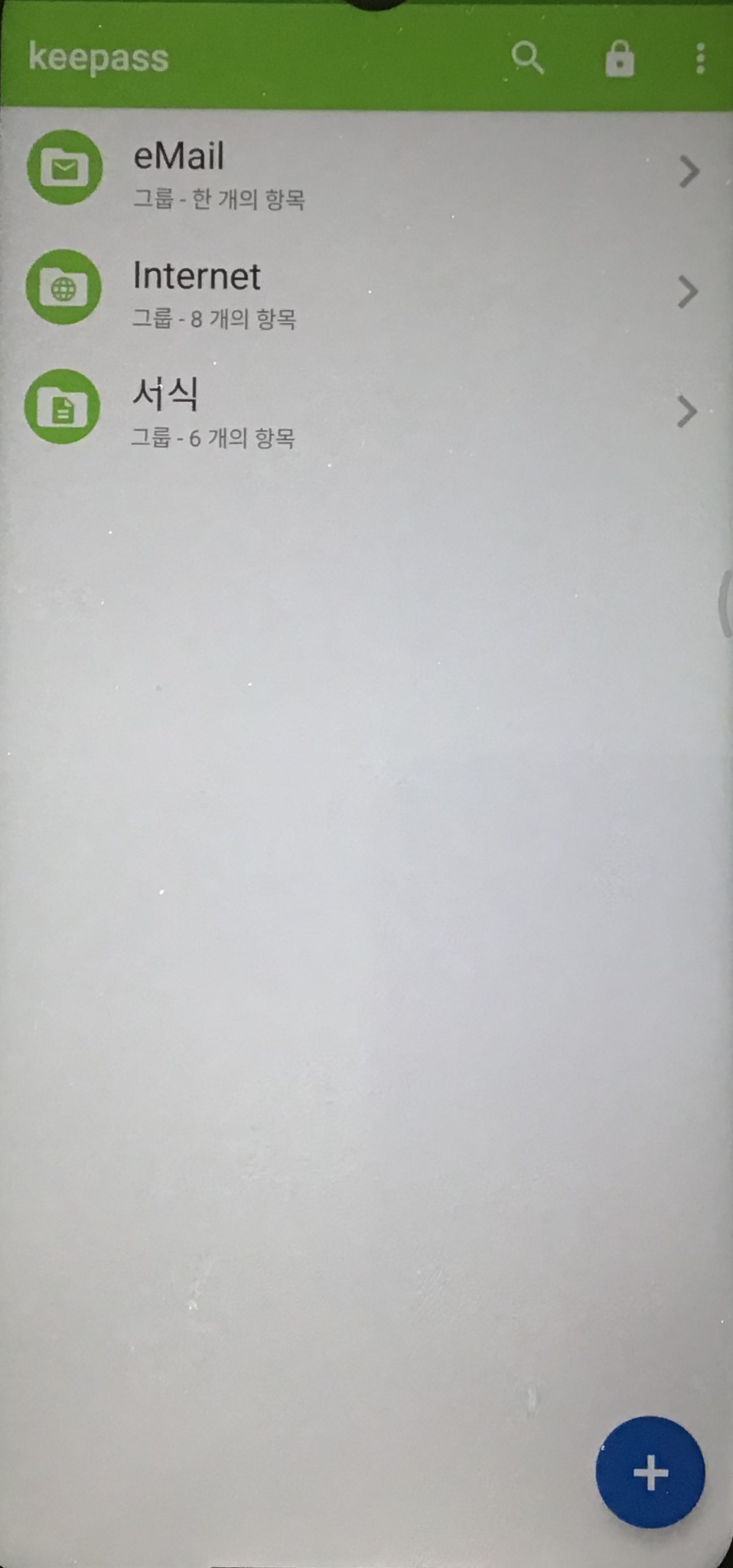 DB를 잠금 해제하면 볼 수 있는 기본 화면입니다. 하단에 + 메뉴를 통해서 보안 메모, 계정 비밀번호 등을 안전하게 저장할 수 있습니다.