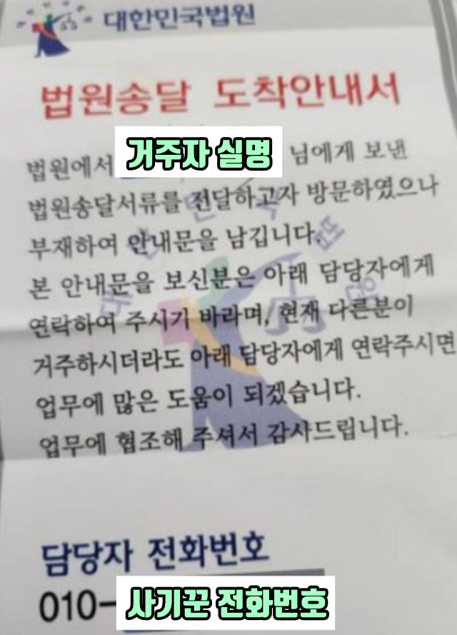 기존 전화로 검찰, 수사관 등을 사칭하는 수법이 진화한 것인데요 실제 거주자 이름을 "법원송달 도착 안내서(위조문서)"에 명시하여 집에 붙여두는 수법입니다. 놀란 거주자가 사기꾼에게 전화를 하게 되면 걸려들게 됩니다.