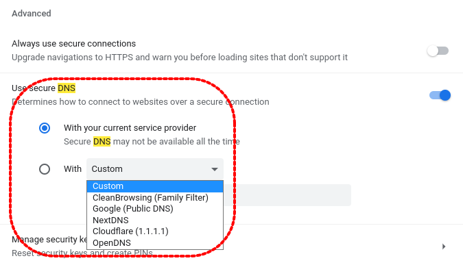 프로그램이나 웹 브라우저의 Secure DNS 부분에서 사용자가 원하는 DNS Server를 선택해서 사용할 수 있습니다. 가장 유명한 DNS가 Cloudflare(1.1.1.1)과 Google DNS(8.8.8.8)이 아닐까 싶습니다.