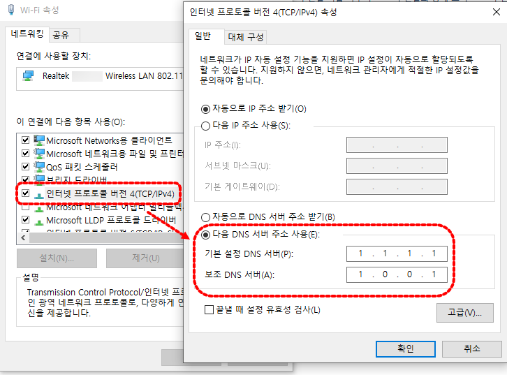 웹 브라우저 자체 기능(secure DNS)을 사용하는 경우 해당 웹 브라우저에만 선택한 DNS가 적용됩니다. 만약 모든 인터넷 통신에 사용되는 DNS를 수정하시려면 "네트워크 어댑터 - 인터넷 프로토콜 버전 4(TCP/IPv4) - 다음 DNS 서버 주소 사용(E)" 부분에 직접 DNS 서버 주소를 입력해 주시면 됩니다.