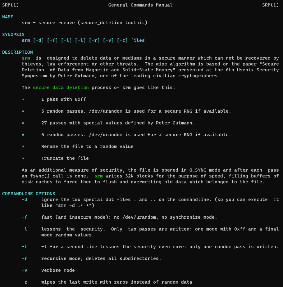 srm -r -v 폴더명과 같이 명령을 하게 되면 기본적으로 38 special passes를 사용하여 파일을 삭제하게 됩니다. 38번 random이나 zero로 데이터를 다 바꾸기 때문에 굉장히 많은 시간이 소요되게 됩니다.