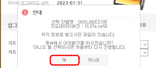 계속해서 이어받기를 하시겠습니까?라는 안내가 나오면 "예"를 눌러서 진행해 주세요. 이때 추가로 업데이트 파일이 받아지는 것 같습니다. 저는 이런 과정을 거쳐서 최종적으로 업데이트 문제를 해결할 수 있었습니다.