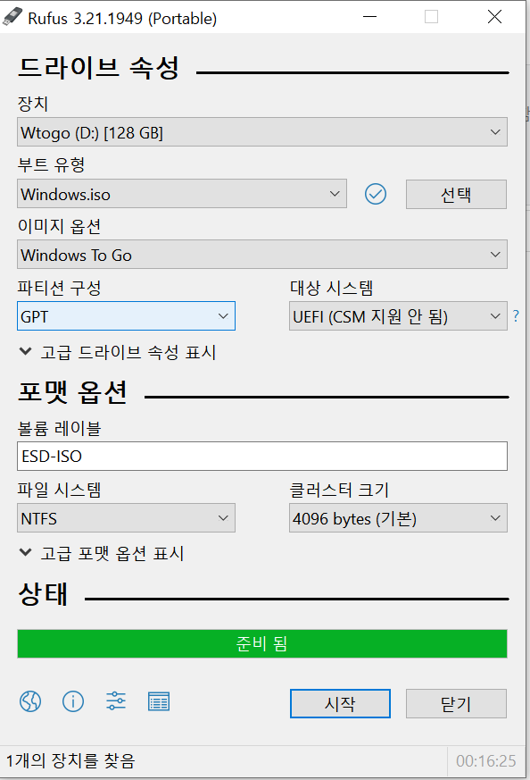 rufus를 실행하고 장치 메뉴에 USB 장치를 선택해 줍니다. 만약 SSD에 설치하는 경우에는 "고급 드라이브 속성 표시"를 눌러서 "USB 하드 드라이브 목록"을 체크해 주시면 장치 메뉴에서 SSD를 선택할 수 있게 됩니다.