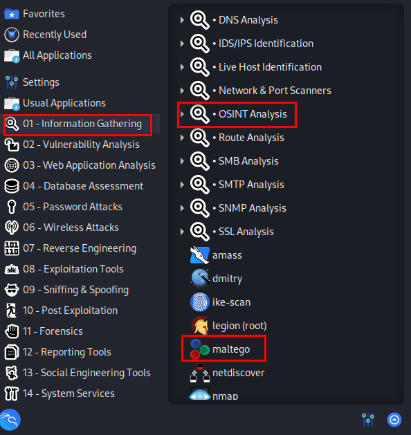 Kali Linux의 기본 메뉴 01-Information Gathering은 정찰, 정보 수집에 관련된 도구들이 모여있는 메뉴입니다. 왜 정보 수집이 1단계일까요? Target에 대한 정보를 수집하고 그 수집된 정보로부터 취약점을 파악해서 공략하기 위함입니다.