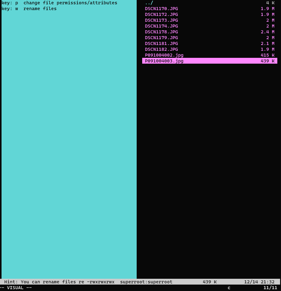 vifm에서는 여러 파일명을 단순히 text처럼 선택하고 변경할 수 있습니다. 변경하려는 파일을 선택하기 위해서 v를 눌러서 visual mode로 변경하고 키보드 화살표를 위/아래로 움직여 선택을 합니다. 전체를 선택하려면 G(shift + g)를 눌러서 한 번에 선택이 가능합니다.