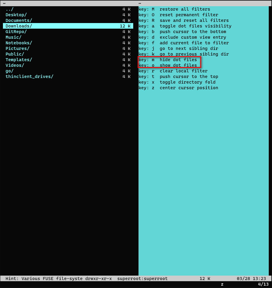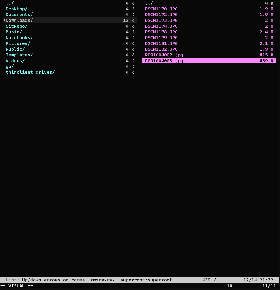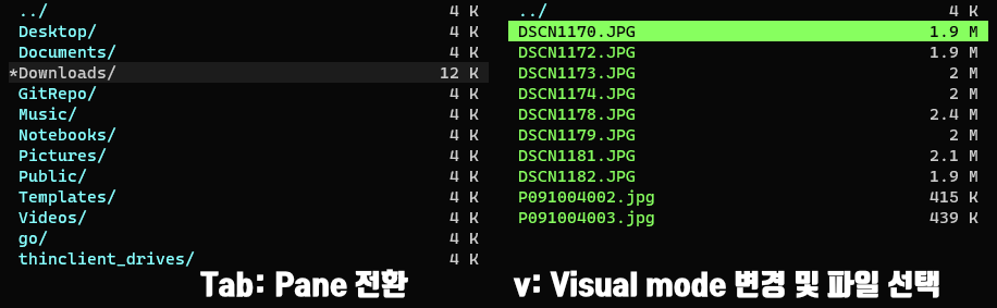 vifm을 실행하면 왼쪽 / 오른쪽 2개의 Pane이 나오게 됩니다. 좌/우 Pane 전환을 하려면 Tab 키를 눌러서 이동이 가능합니다.