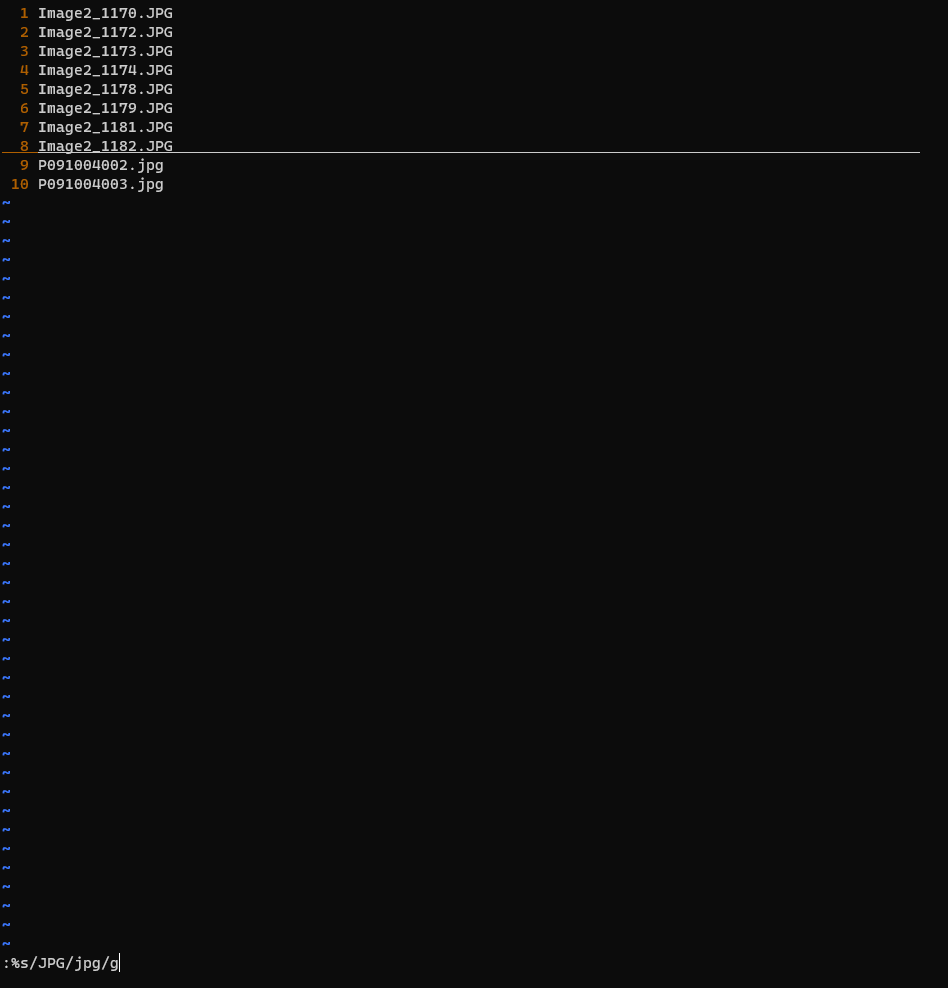 :%s/JPG/jpg/g 와 같이 명령을 하게 되면 JPG를 찾아 일치하면 모두 jpg로 변환하게 됩니다.