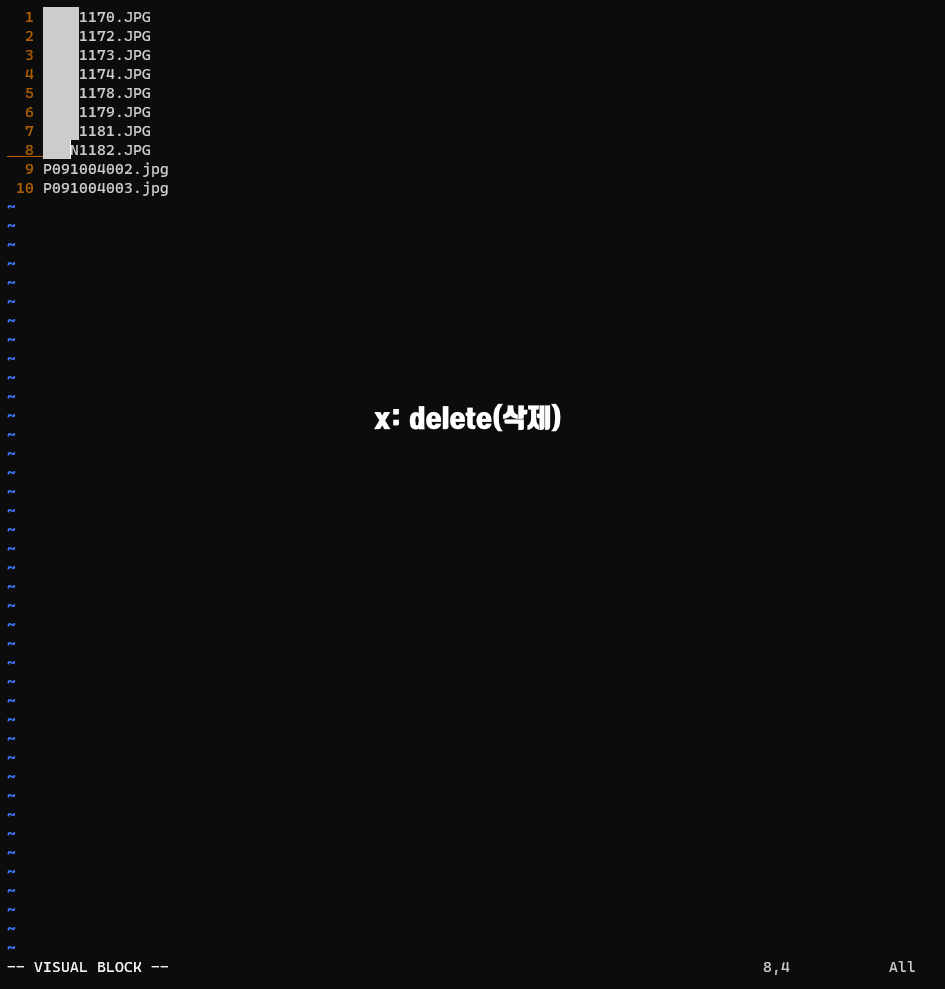 선택한 부분을 삭제하려면 x를 누르면 visual block으로 선택한 모든 부분이 삭제됩니다.