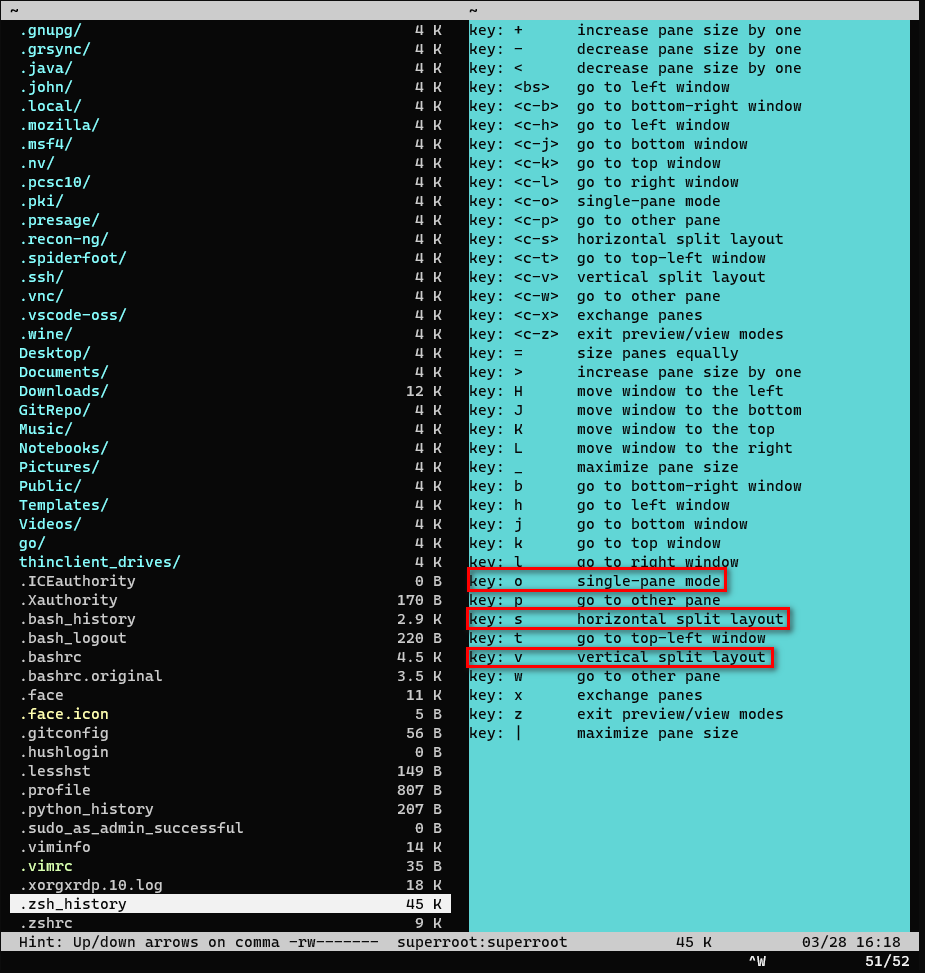 Ctrl + w를 누르면 Pane 관련한 메뉴를 확인할 수 있습니다. o는 싱글 pane, s는 위/아래로 나누는 horizontal split, v는 좌/우로 나누는 vertical split layout입니다.