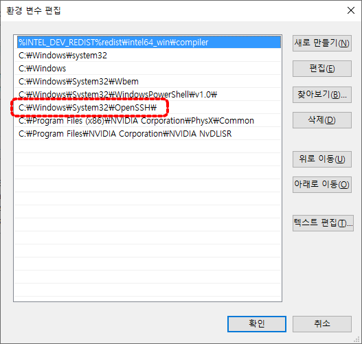 기본적으로 설정된 Path list입니다. OpenSSH 폴더가 기본적으로 등록되어 있기 때문에 cmd(명령 터미널)에서 ssh, scp, ssh-keygen 명령어를 사용할 수 있습니다.