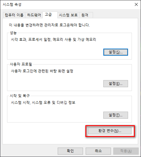 [시스템 속성] - [고급] - [환경 변수]를 선택합니다.
