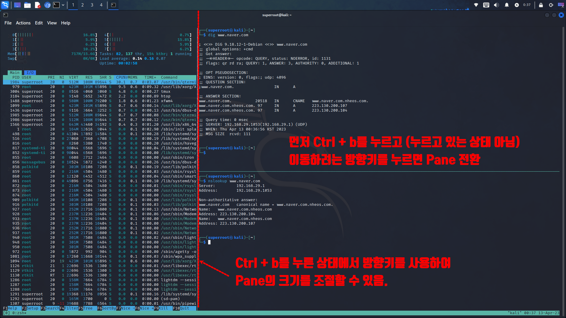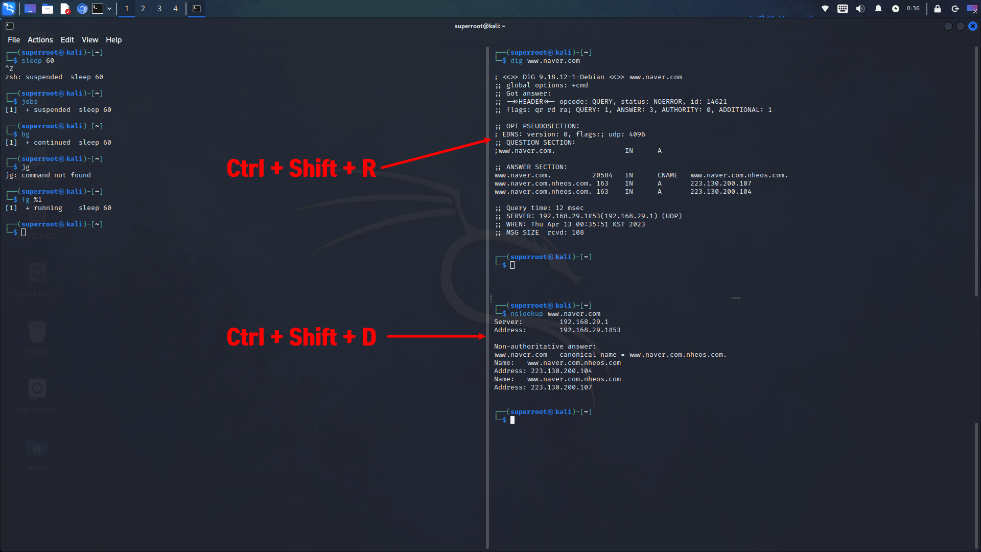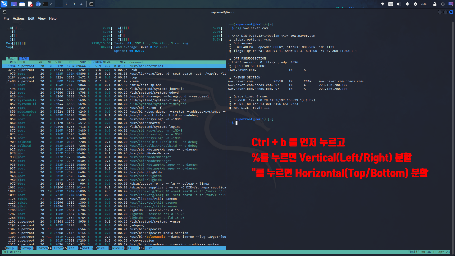 터미널 멀티태스킹 및 창 분할(Terminal multi-tasking, tmux pane/windows split on Kali Linux)