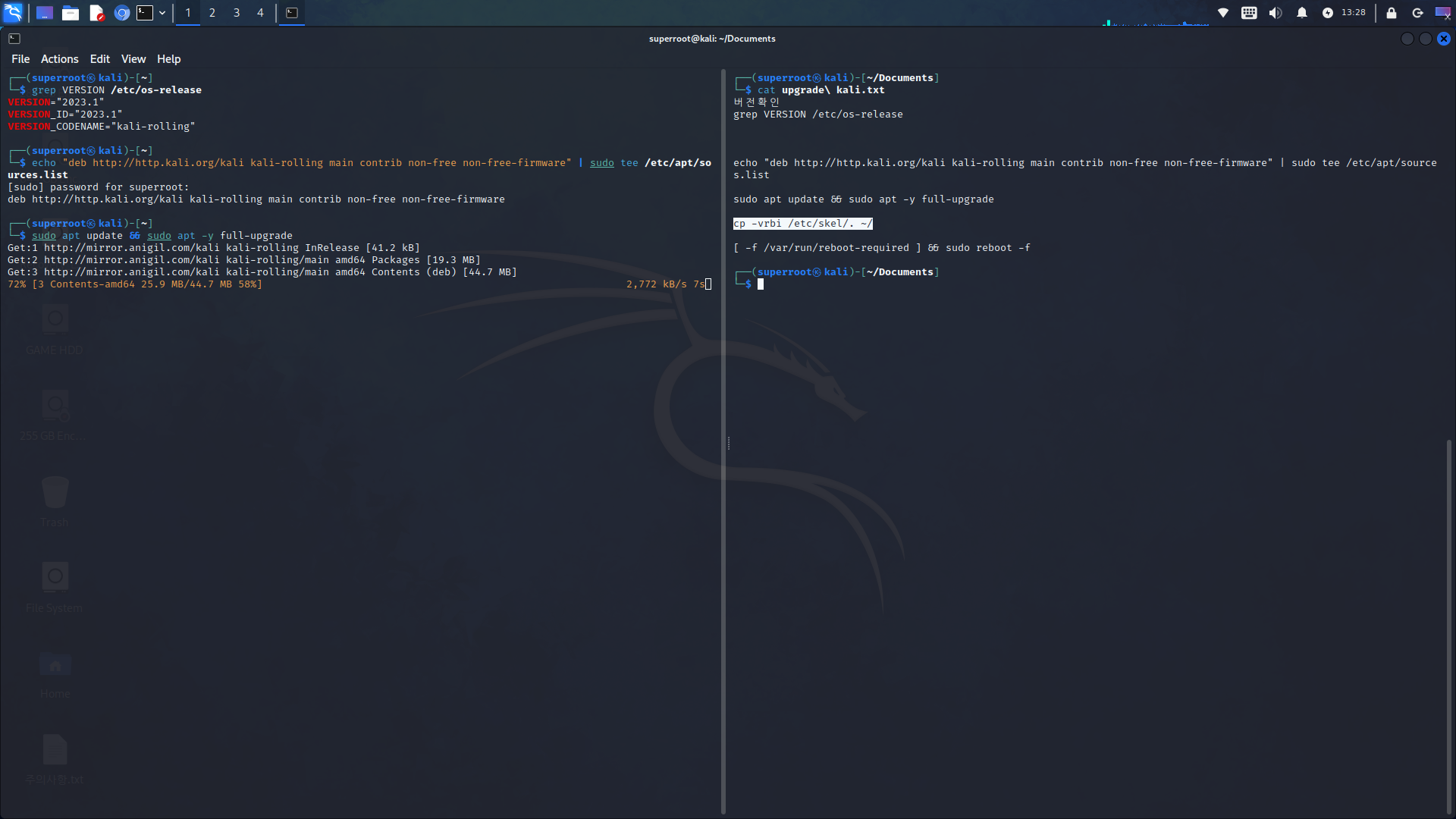 운영체제 버전 업그레이드를 위해 우측에 관련 명령어를 띄워두고, 좌측 pane에서 순서대로 운영체제 업데이트를 진행하거나 man page를 띄워두고 명령어를 사용하는 등 다양하게 사용할 수 있습니다.