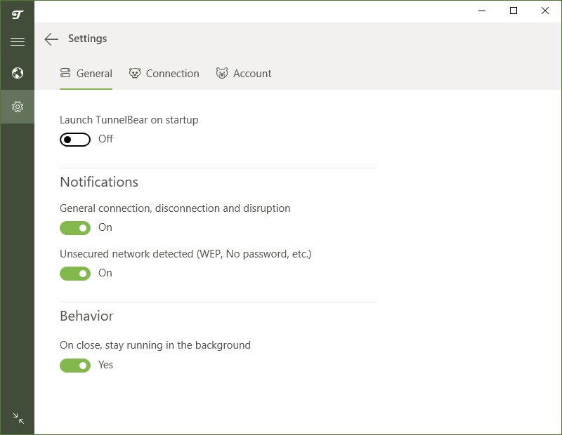 윈도 운영체제 시작 시 TunnelBear의 자동 실행을 원하는 경우 General에서 "Launch TennelBear on startup" 부분을 활성화시켜주시면 됩니다.