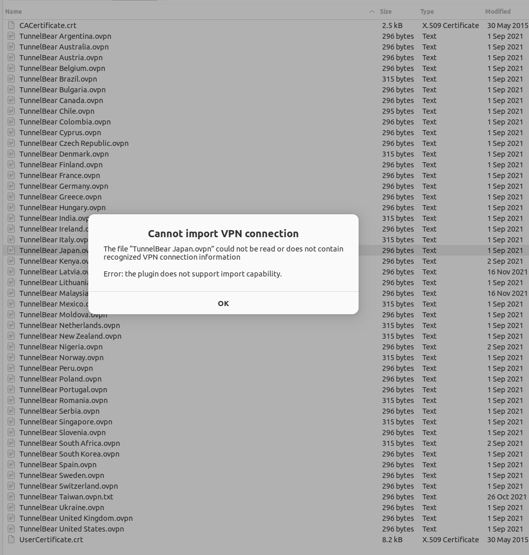 TunnelBear Blog에서 openvpn.zip(openvpn config files)을 다운로드하여 압축을 해제하면 세계 각국의 VPN 서버 config 파일과 UserCertificate.crt, CACertificate.crt 파일이 있습니다. Import VPN Configuration 메뉴를 통해서 해당 설정 파일을 불러오면 "Cannot Import VPN connection"이라는 에러가 발생하게 됩니다.