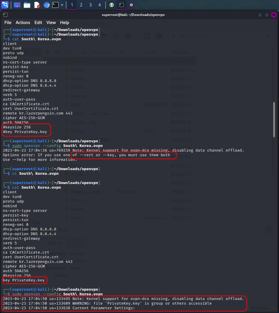 [명령어] echo "key PrivateKey.key" >> *.ovpn 과 같이 명령어를 입력하시면 모든 설정파일 마지막 줄에 key PrivateKey.key가 추가됩니다.