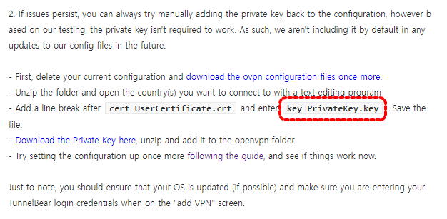 PrivateKey.key 파일이 openvpn.zip 파일에 없어서 해당 문제가 발생하는 것 같아서 TunnelBear help desk에 PrivateKey.key 파일을 요청하고 바로 6시간도 지나지 않아 이메일로 회신을 받았습니다. PrivateKey.key가 없어도 정상적으로 될 것이라고 했지만 제 경우에는 꼭 PrivateKey.key 파일이 필요했습니다.
