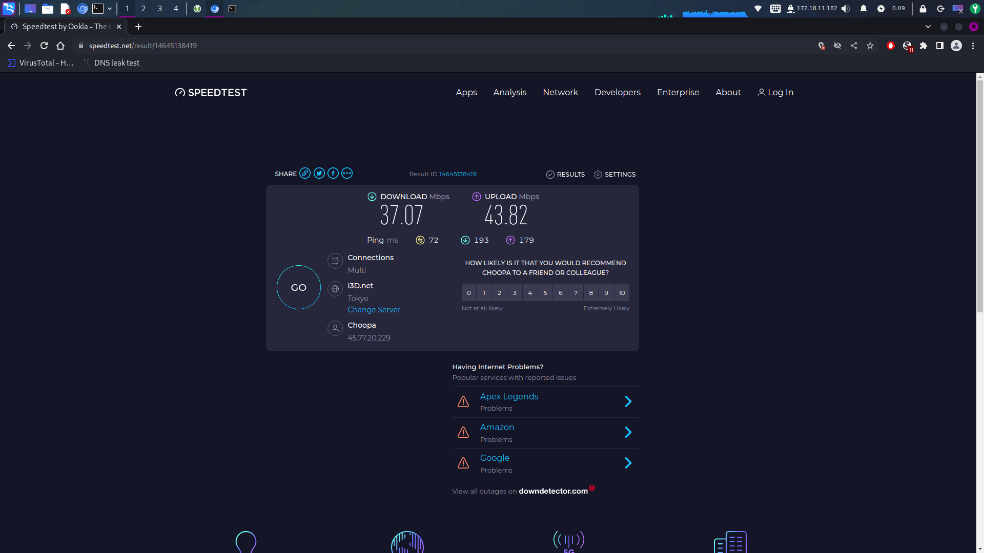Kali Linux에서 speed test를 해봤는데 37~ 43 Mbps 정도 나오는 것 같습니다. 윈도에서는 더욱 빠르게 나옵니다.