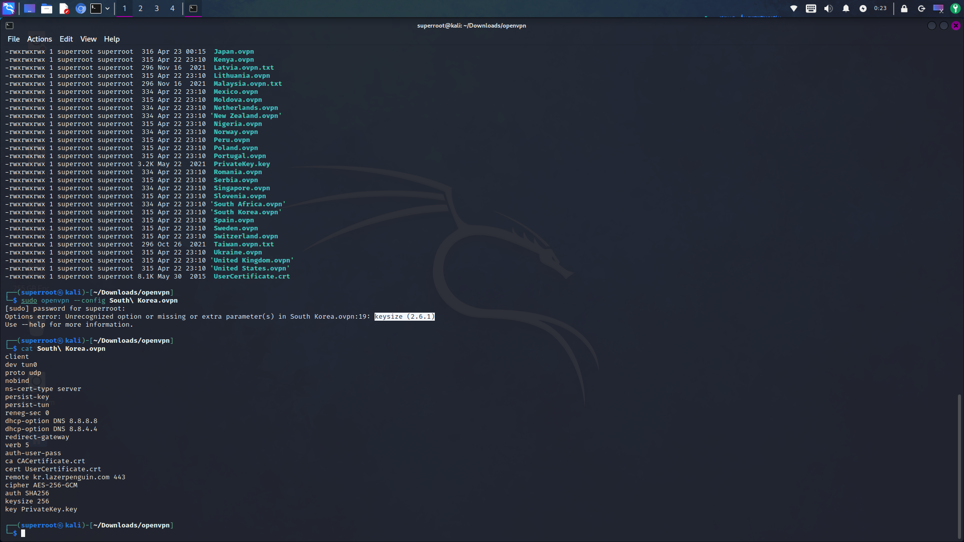 헉! "keysize (2.6.1)"관련 에러가 발생합니다. 그래서 설정 파일에서 "keysize 256"부분의 앞에 #를 추가하여 주석 처리를 했습니다.