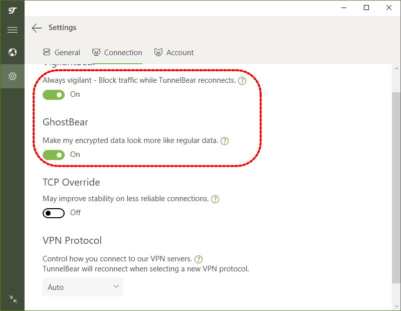 Connection에서 Always vigilant, GhostBear 2개 메뉴를 활성화시켜주세요. Always vigilant는 VPN 연결이 잠시 끊어지면 인터넷 연결을 차단해 주는 일종의 Kill Switch 기능인 것 같습니다. GhostBear는 VPN 암호화된 트래픽을 regular data처럼 보이게 해주는 기능입니다.