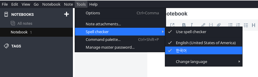 [Tools] - [Spell checker] 메뉴에서 "한국어"도 추가하여 맞춤법을 점검하실 수 있습니다.